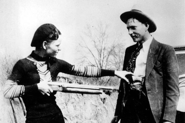 Bonnie Parker (1 de octubre de 1910 – 23 de mayo de 1934) y Clyde Barrow (24 de marzo de 1909 – 23 de mayo de 1934) fueron dos famosos fugitivos, ladrones y criminales de los Estados Unidos. Bonnie y Clyde captaron la atención de la prensa estadounidense y fueron considerados como "enemigos públicos" Nº1 tambien en su tiempo. Otra pareja que forma parte de la cultura yanqui.....usaron de todo, la Thompson, escopetas de corredera, y como no, el mitico Browning BAR del 30-06