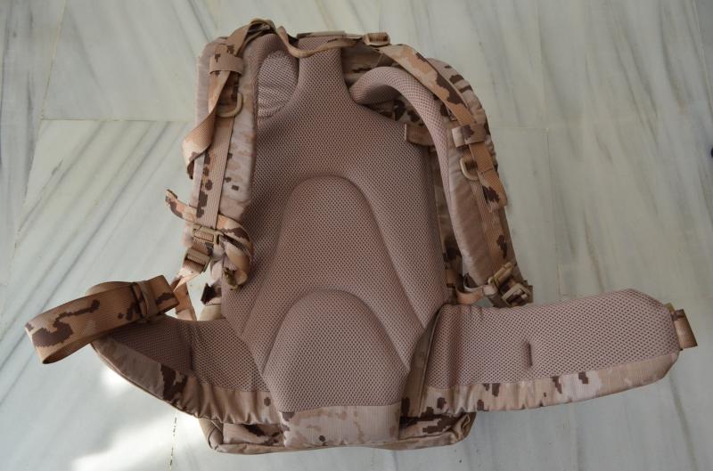 La mochila es de unos 40 litros, cinturón desmontable, espalda acolchada con una placa de plástico semirrígida para mayor comodidad, ganchos interiores para bolsa de agua, compartimento principal y delantero, y red para llevar material ligero.