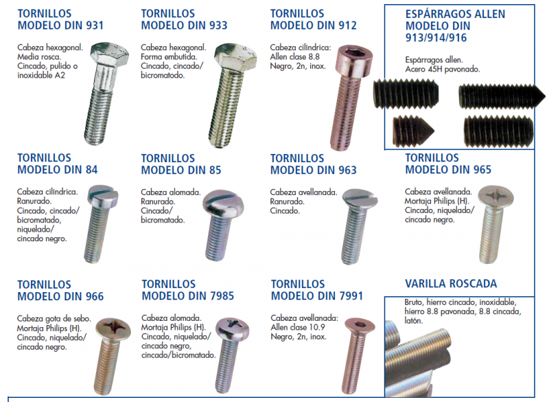 Una foto de varios tipos de tornillos standard, y sus nombres.