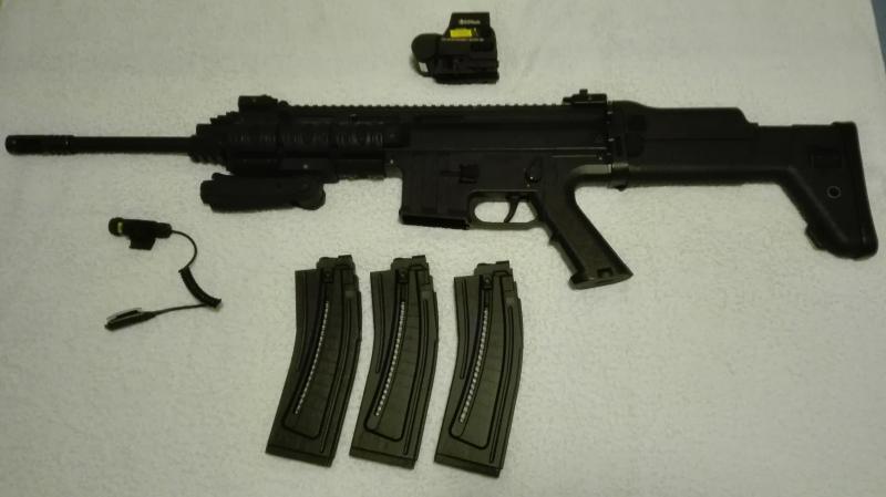 láser punto rojo de UTG,cubre raíles de goma UTG , montura para bipode tipo Harris,porta fusil y si interesa tambien incluiria holografico tipo eotech 558 (Chino) pero que a las distancias de uso de esta carabina funciona perfectamente.