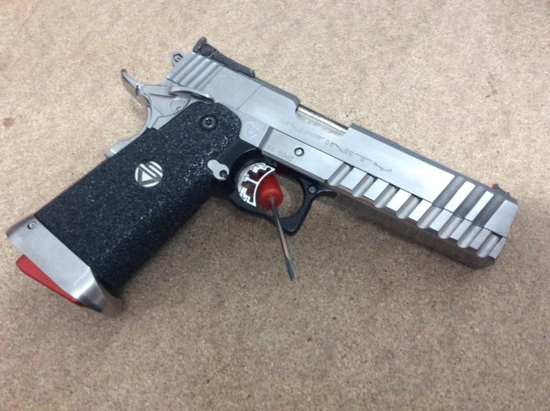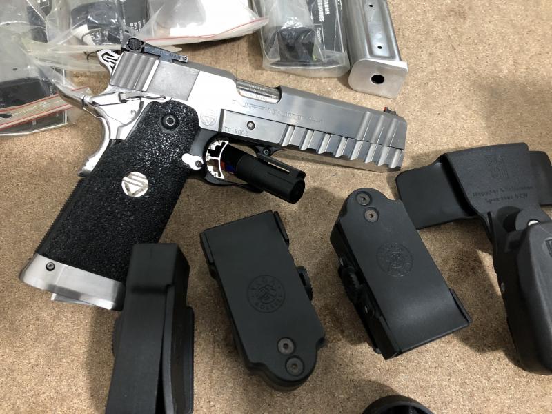 Se entrega con 4 cargadores, 2 cartucheras de desenfunde rápido, 4 porta cargadores, cinturón, y de regalo un cañón del 40sw, 6 cargadores de 40 sw, y alguna cosa más.