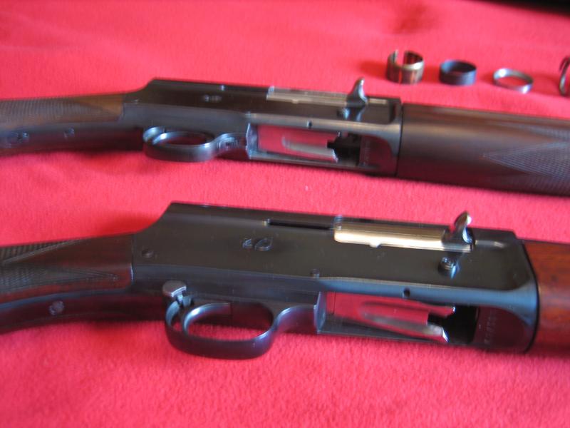 De las dos Auto 5 que tengo, este cañón slug se lo voy a acoplar a la de 1959, con sistema Speed loading y limitador a 3 cartuchos. Aquí os la pongo junto a su hermana, la de 1929 de 5 cartuchos y seguro delantero, ambas de acero y sin banda en el cañón: