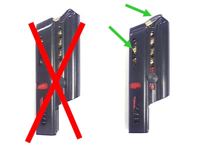 Es claro que si la primera bala queda como en el dibujo de la izquierda, no entra ni en el primer montado manual del cierre, por lo que la primera bala debe ir levantada como muestras en la foto de la derecha. Pero francamente yo no prestaba atención a como quedaban las balas de abajo, ya que éstas siempre me han alimentado bien (si no quedaba vaina pillada al salir, claro).
