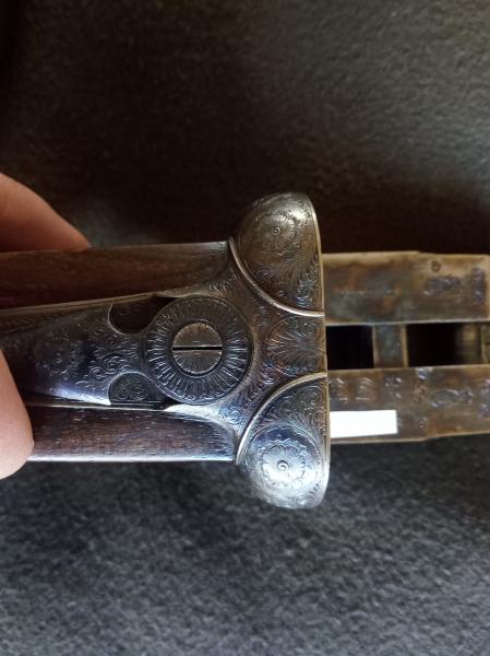 Cañones demiblok de acero boehler antinit en impecable estado, con choques de 4 y 3 estrellas. Triple cierre. Pletinas largas con finos grabados tipo purdey. Doble gatillo, con el primero articulado. Culata de madera de nogal, de tipo inglesa, con lágrima.