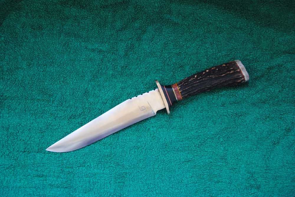 Acero d2 19 cm. de hoja por 3,5 cm y 6 mm de grosor. Guarda sencilla de laton,ebano, coral y un precioso sambar con tapa de ciervo espero que os guste.