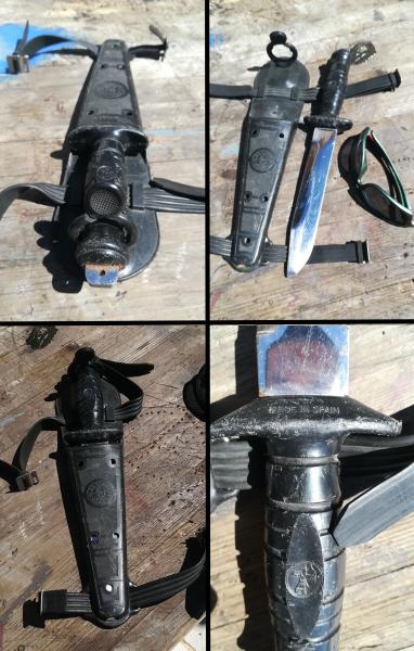 -Nemrod. Cuchillo de buceo muy gastado. La hoja es lo que mejor se conserva. Sierra en el lomo, punta plana. Cabo con el plástico rajado y funda con retenedor roto. Tiene todo, pero en mal estado de conservación. Para nostálgicos. 15 euros envío incluido.