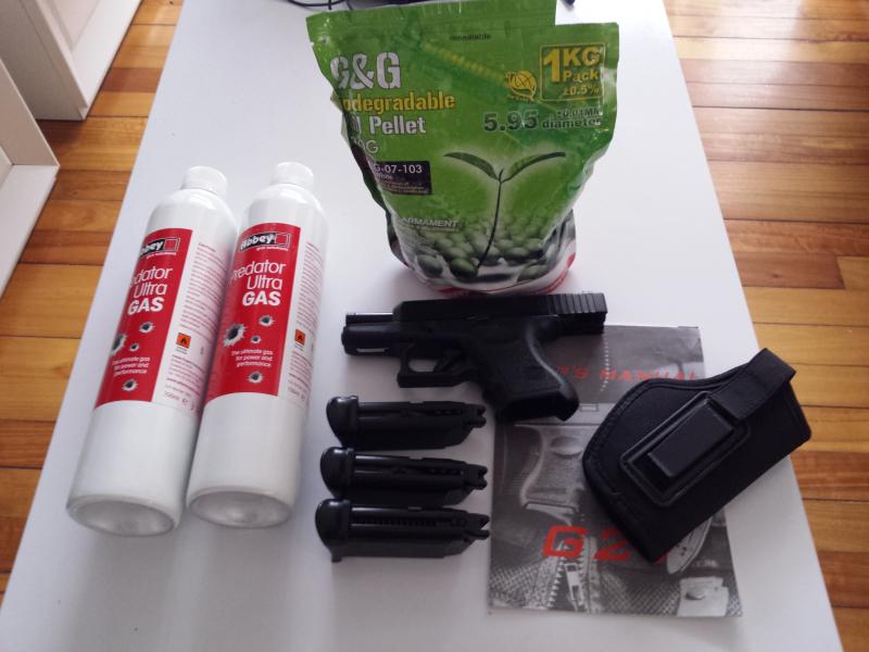 Kjw G-27 . REPLICA DE LA GLOCK. prácticamente a estrenar, es la cara, de corredera metálica Blowback, con 3 cargadores, funda, botellas y bolas. 95 euros. Cambiaría por cuchillo de caza asta de ciervo.
