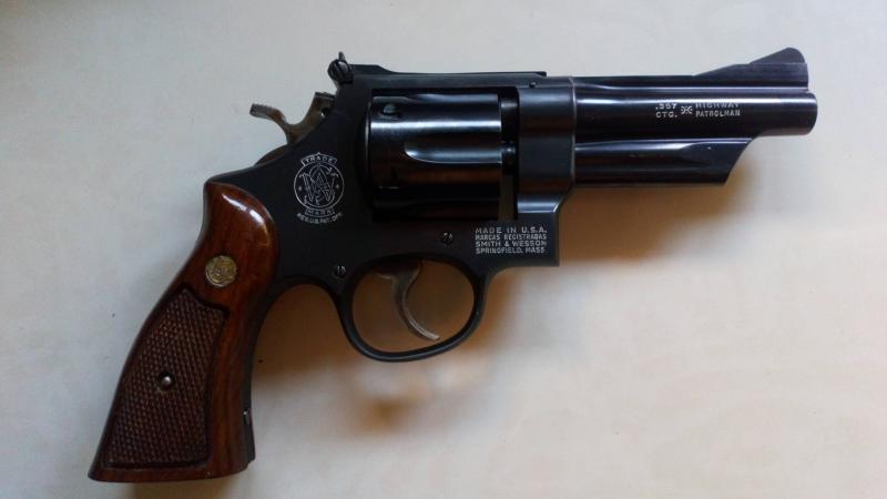 Algunos decían que era un revolver con acabados más toscos que el 27(más caro y pensado para el mercado civil) pero tiene una mecánica envidiable, un disparador en doble acción muy cómodo y en simple acción muy suave y corto, un pavonado pulido en las caras laterales, y mate/rugoso para evitar destellos y resbalones en la zona superior e inferior. Se presenta con cachas de servicio en madera, con anagramas SW y un encuadrillado sin golpes ni roces.