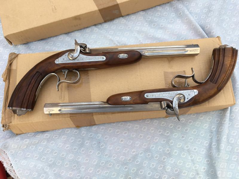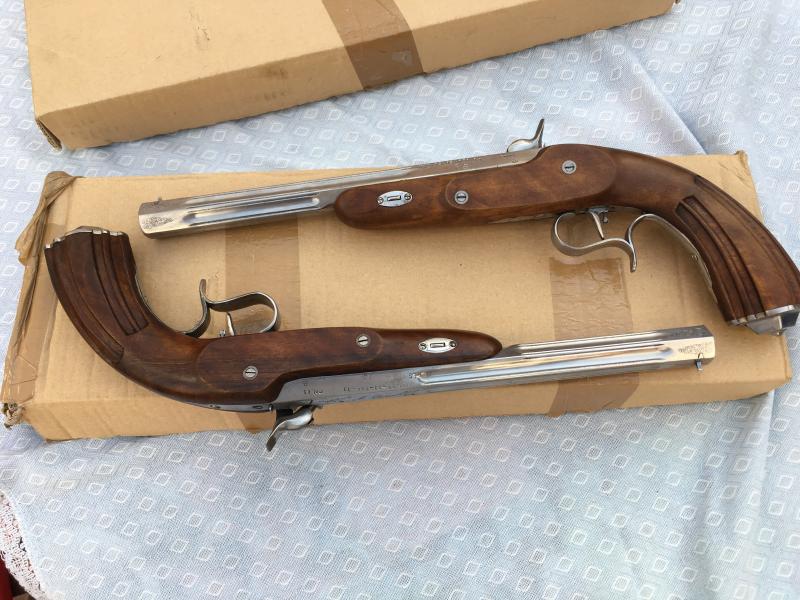 Vendo pareja de pistolas de duelo marca ARSA modelo Imperio. Nuevas a estrenar. Calibre 45. Tienen grabado en la parte superior del cañón el nº 1 y el nº 2 y mi inicial y mi apellido. Una nimiedad para algunos, y quizá un detalle a tener en cuenta para otros. Disculpad el error de no comentarlo en un primer momento.