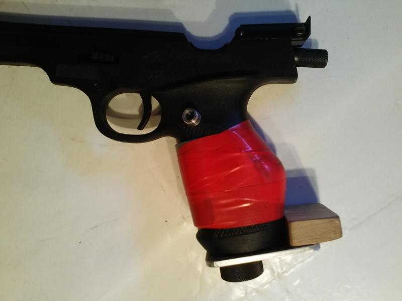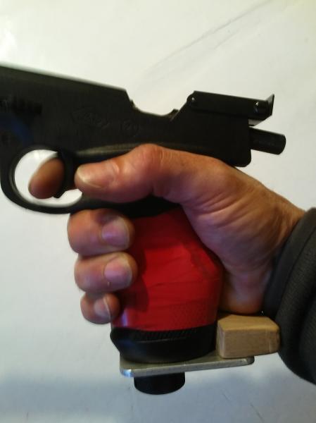Con la cinta roja sujeto un trozo de tubería de pvc en la parte anterior de la empuñadura para lograr que las segundas falanges queden perpendiculares al cañón. Es una prueba. No le veo ventaja notable.