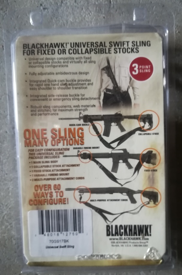La correo táctica negra, de tres puntos de anclaje, es una correa original de la marca BlackHawk (no una mala réplica de airsoft) y me costó unos 50,00 €, creo recordar. Asimismo, conservo su caja y lo que venía en la misma (la adquirí en la Armería Marcial, en Ourense).