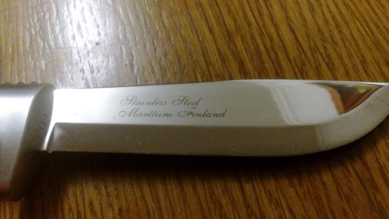 - Cuchillo Marttiini, comercializado por Rapala, mango de goma antideslizante y funda de cuero