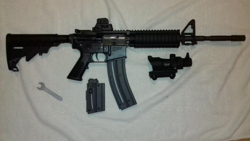 Vendo carabina Colt M4 OPS en calibre .22 LR. Carabina semiautomática fabricada en Alemania por la casa Walther e inspirada en el diseño de la mítica carabina de combate M4 Carbine, perfecto estado de funcionamiento, cargador para 10 cartuchos y otro para 30,regalo visor de punto rojo replica, funciona perfectamente.