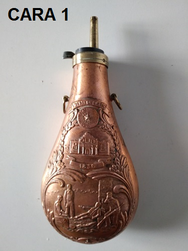 Polvorera fabricada a mediados de los 60 muy bien conservada, de buena calidad realizada con piezas de bronce y cobre con boquilla de medidor de cargas en buen estado y asas de bronce para colocar correa y colgar, sus caras están decoradas con trabajados en relieve de la batalla de san Jacinto 1836 la lucha de independencia de Texas. Sin contar la boquilla mide 17, 5 cm de largo * 9 cm de ancho. Precio 35€ con envio en penindula.