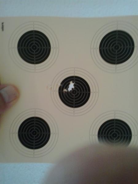 La posición de la diana es la que se ve, pues es mas ancha que alta, seis disparos unos casi encimas de otros, y los tres primero fuera del negro, total nueve.