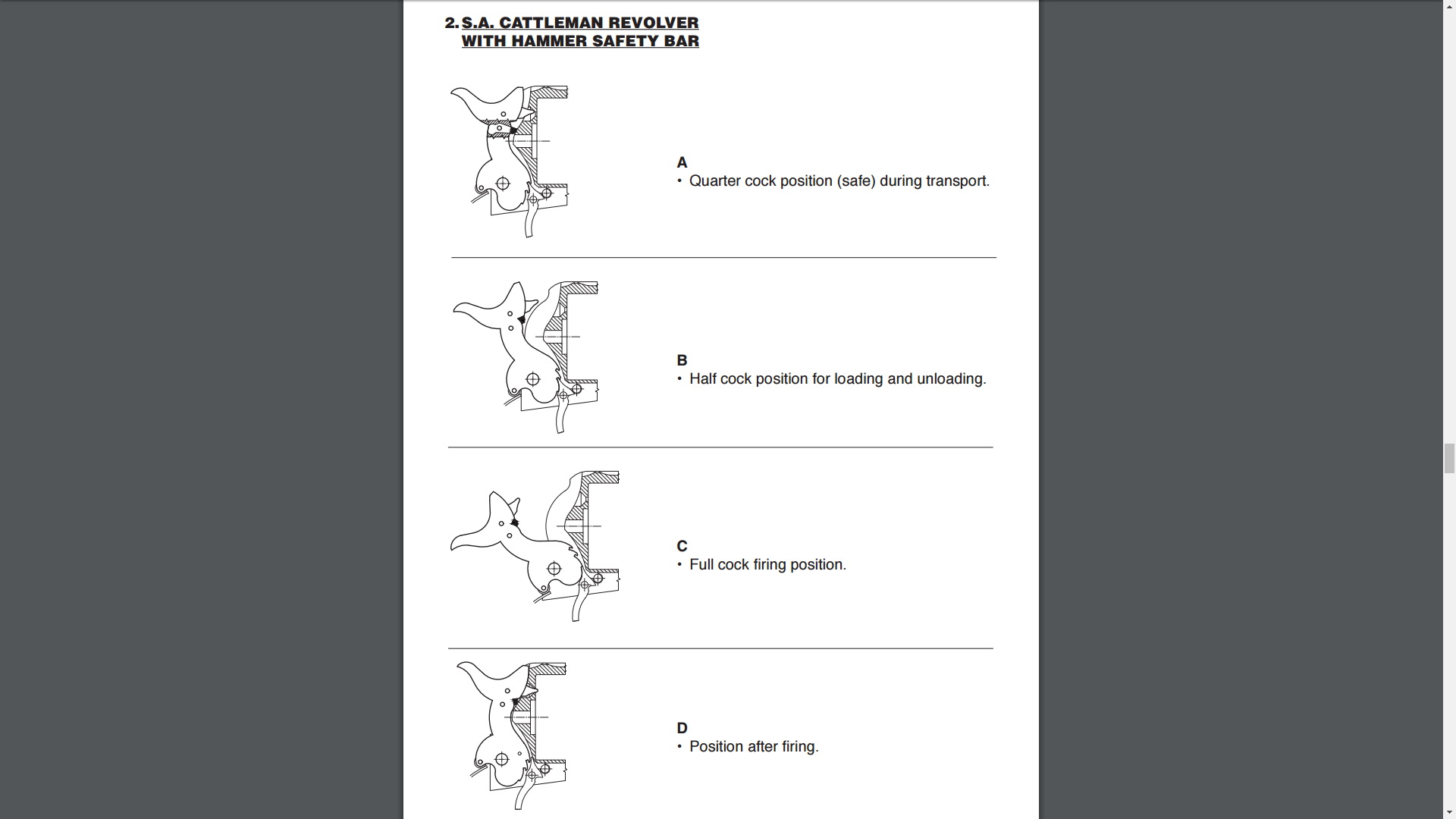 Solo añadir que aparte de la barra de dos posiciones el Cattleman de Uberti de una sola acción sí es capaz de cargar 6 cartuchos, si el martillo esta en la posición más adelantada D en el diagrama ó de disparo evidentemente esta en contacto con el pistón, por lo que si el revolver se cae y el martillo recibe un fuerte golpe puede percutir el cartucho, pero si el martillo esta en la posición de half cock ó tambien llamada de quarter cock la A en el diagrama, sobresale una pequeña muesca de tal manera que frenaría cualquier intento del martillo de percutir el pistón, solo hay que ponerlo en esa posición, es igual que con los rifles de palanca y su posición half cock.
