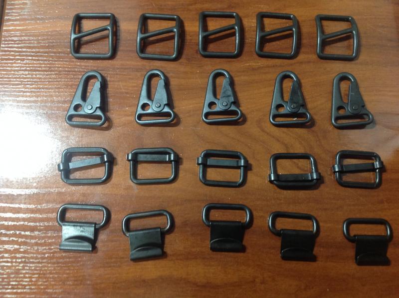 Dispongo de cinco juegos de herrajes para correas de armas largas. Cada juego de herrajes está compuesto de cuatro piezas. El precio de cada juego es de 12€.