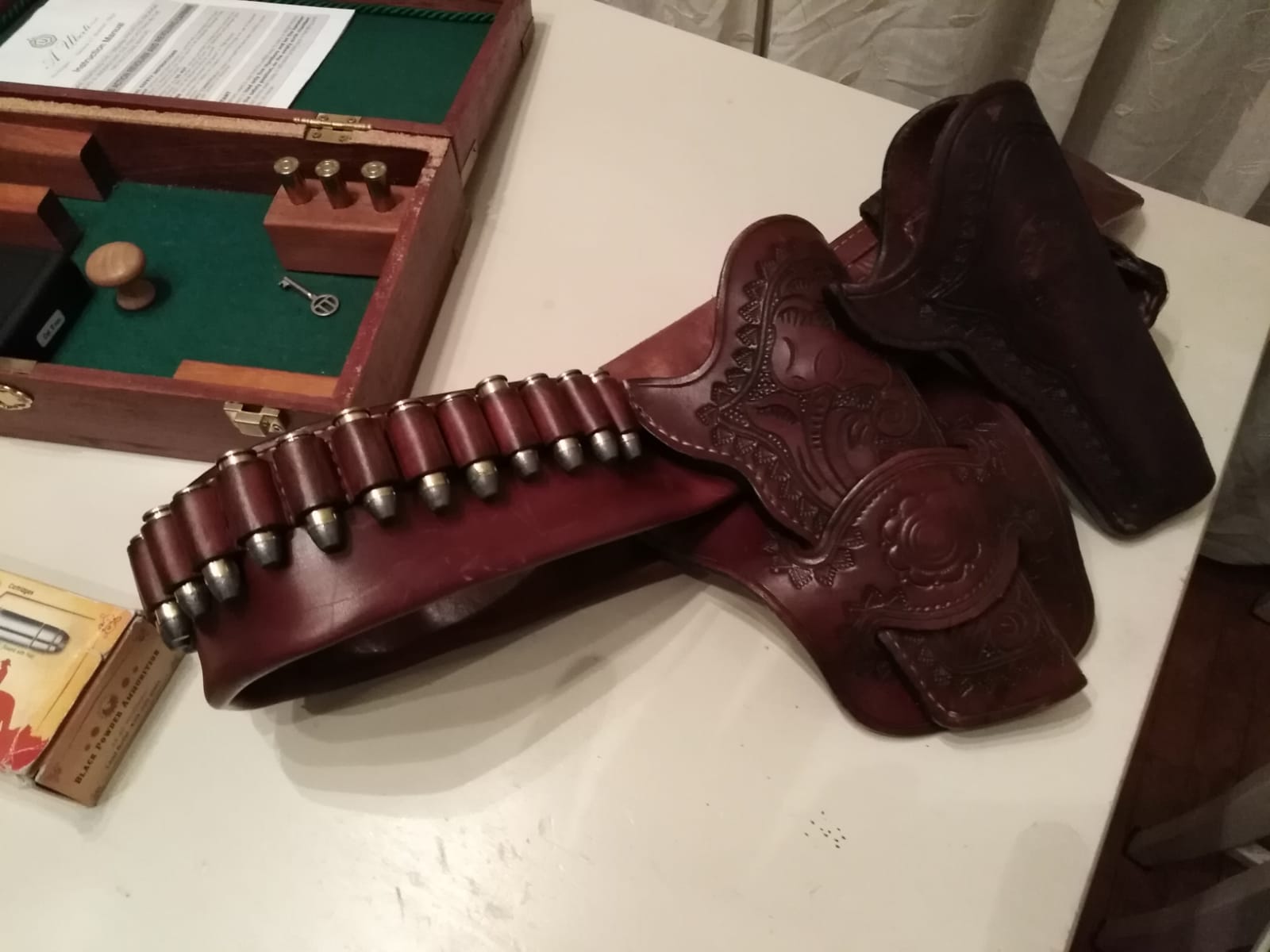 Tambien vendo preciosa canana de piel de silla de montar con 2 cartucheras repujadas, hecha artesanalmente. Mas estuche de madera de londo y municion (40 balas aprox).