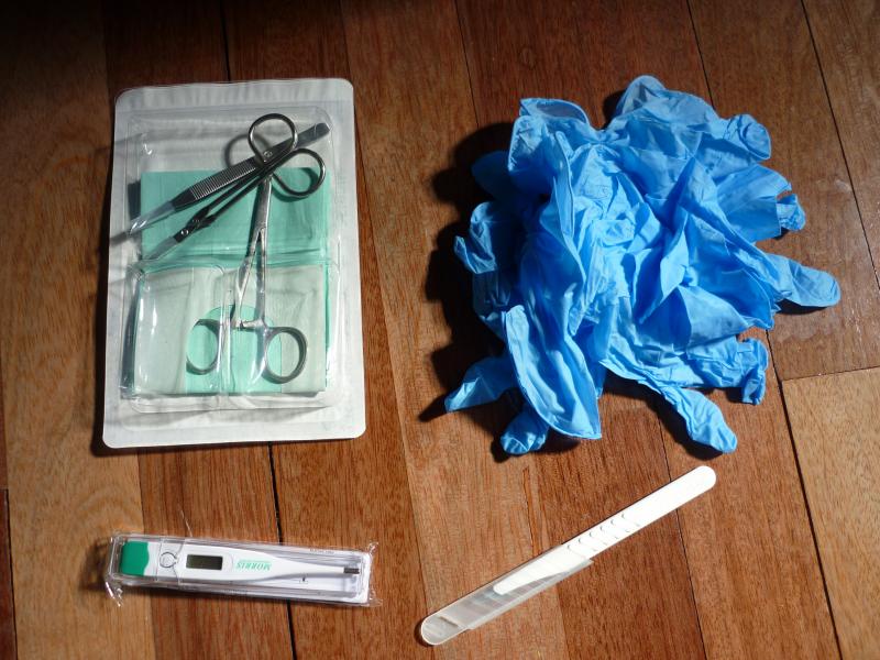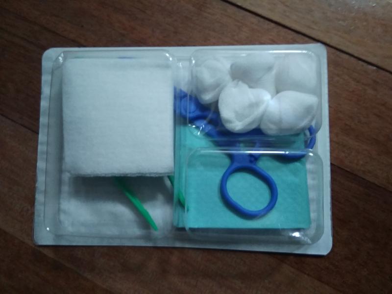 Kit Mediset compuesto de : tijeras de corte y de sutura, pinzas adson en acero quirurgico, 5 compresas de gasa de 7,5 x 7,5 y bata/babero desechable.