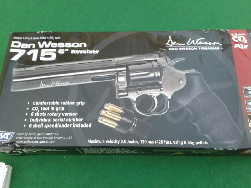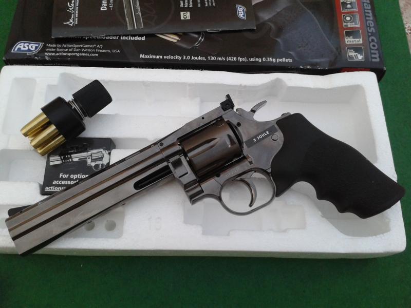 Muy buenas gaviota, yo he tenido en mi poder hasta que lo vendi cansado de gastar botellitas un Dan Wesson Mod. DW 715, Cañón externo de 6” con marcajes .357 Magnum,( no el de airsoft) en calibre 4.5 mm. El revólver es de simple y doble acción, con 3 julios de potencia y una velocidad de 430 FPS , trae un seguro muy discreto debajo de su gatillo y Grips de goma con logo de DW. tiene en 6" el peso real del arma que copia 1250 gramos. Te paso video y fotos del mio.