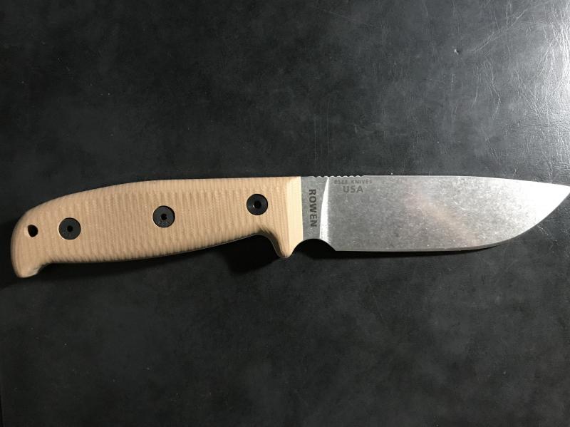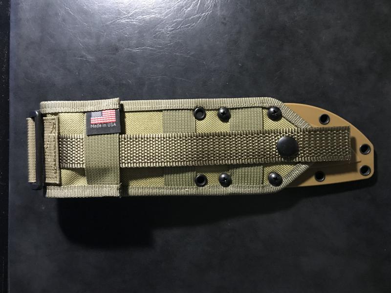 Buenas, pues eso que me compré el ESEE-5 pero para el uso que le quería dar era demasiado pesado y he adquirido este ESEE-4 con acero 440C, originalmente venía con cachas de micarta verdes y vaina negra, no me gustaba mucho y lo he personalizado un poco, con cachas en G-10 marrones, vaina marrón y sistema de transpote y sujección caqui compatible con molle, os dejo unas imágenes a ver qué os parece.