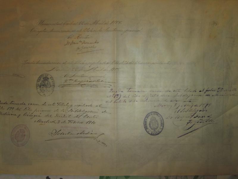 Licenciado en Medicina y Cirugía por la Universidad de Madrid en Marzo de 1898, y natural de Guantánamo Cuba Española en aquella fecha. En la parte posterior están las firmas y sellos de confirmación de autenticidad y asiento.