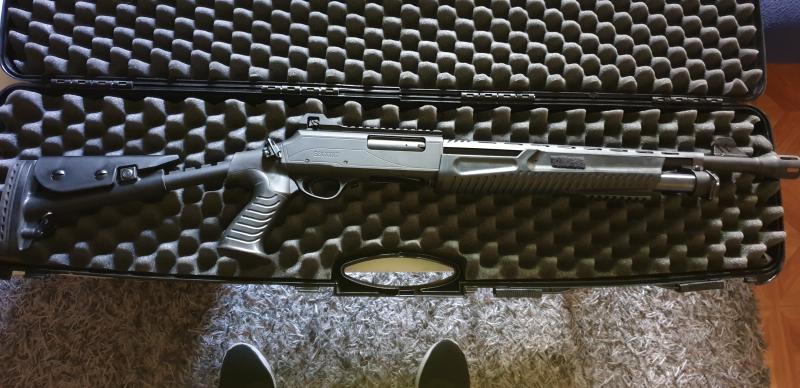 Escopeta táctica de repetición, con culata tipo M4 (valorada en 60 euros), anilla para correas de un solo punto, y velcro instalado para linterna o láser en rail picantiny, miras Oring, banda de ventilación sobre el cañon,bocaha apagallamas, carriles tácticos en cajón de mecanismos y guardamanos.
