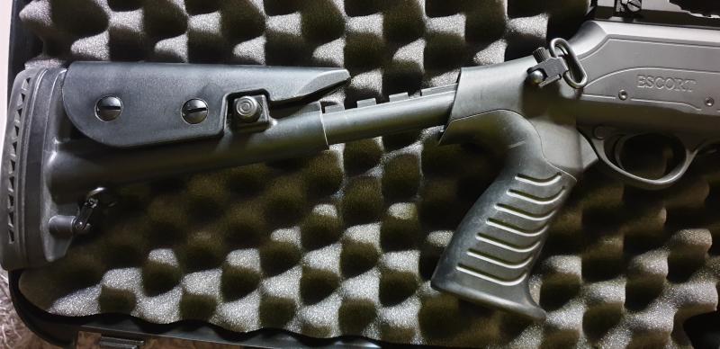 Escopeta táctica de repetición, con culata tipo M4 (valorada en 60 euros), anilla para correas de un solo punto, y velcro instalado para linterna o láser en rail picantiny, miras Oring, banda de ventilación sobre el cañon,bocaha apagallamas, carriles tácticos en cajón de mecanismos y guardamanos.