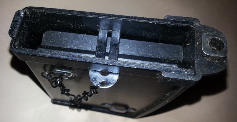 Lo de la cadenita es muy sencillo, como el cargador no es tal sino un almacén extendido no tiene labios que abracen la munición, si lo cargas fuera de su alojamiento saltarían los cartuchos si no los sujetas, la cadena tiene un pasador que evita que esto ocurra y se desparrame la munición mientras lo colocas en su sitio