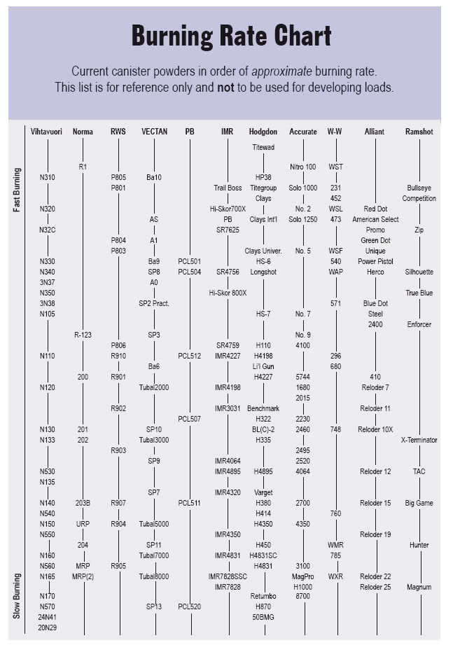 Todo esto depende también de los lotes y fecha de fabricación, pero en general lo que esta claro es que unas pólvoras son mas rápidas que otras en muchas de las tablas de los fabricantes por lo que mejor ir con cuidado.