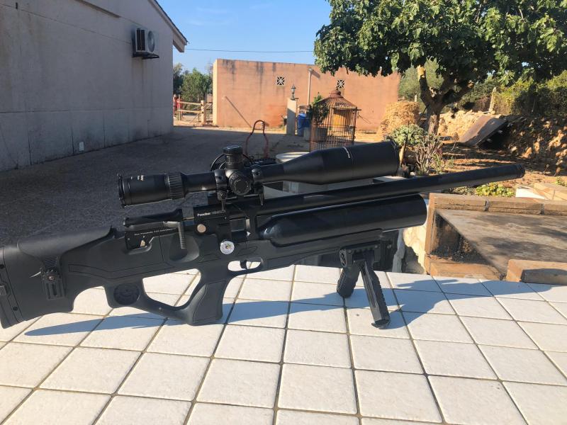 muy precisa en ambos calibres con botella de 500cc culata de polímero bipode y maleta