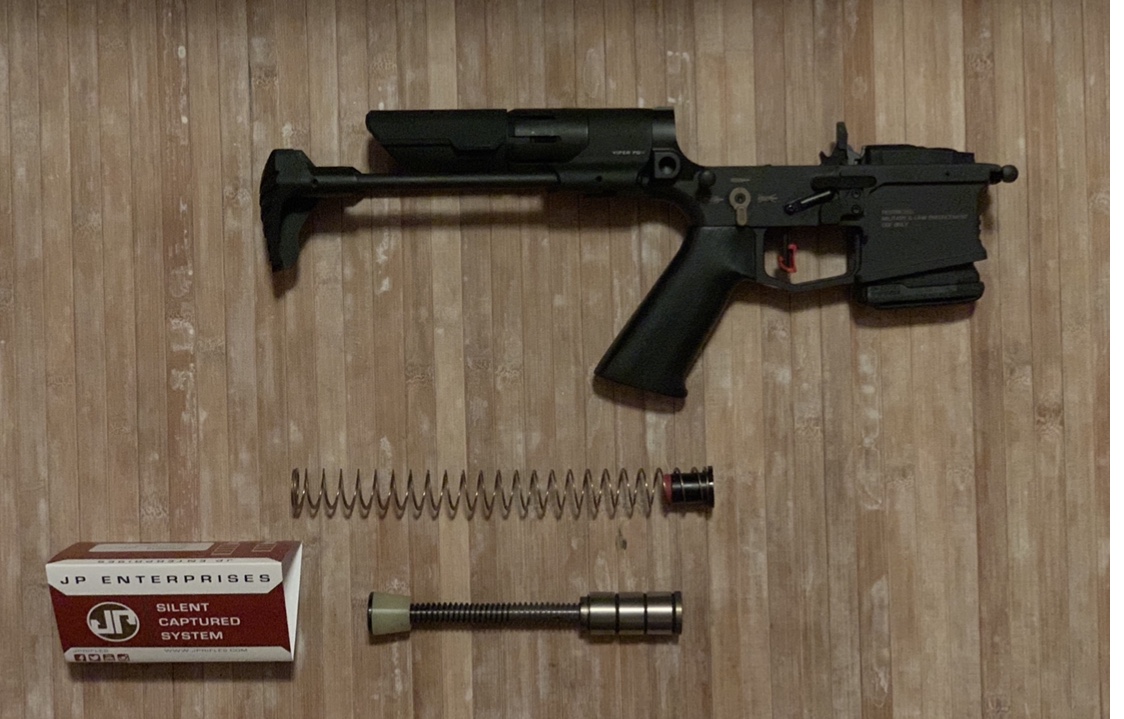 -Amortiguador del cierre (buffer) JP Enterprises, con muelle guiado para reducir roces generadores de ruidos y minimizar vibraciones en aras a una mayor precisión. El cabezal del buffer tiene un peso de 25 gramos. El muelle recuperador alcanza los 9 kg/fuerza en compresión máxima.