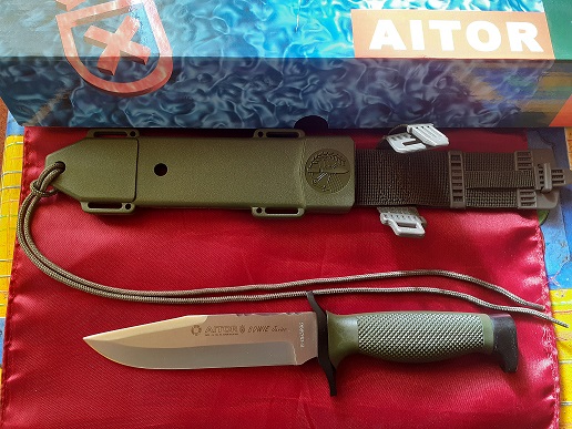 Machete Aitor modelo Bowie Junior Nato : Hoja enteriza de Acero Mova ( 58 HRC ) de 15 cm. Con empuñadura y funda de poliamida verde. En su caja original.