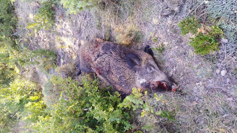 El sábado pasado jabalí de 70 kg,s sale en el ángulo que hacen dos puestos, el mío y el de un compañero. Cuando sale de la línea de ambos tiro y casi al unísono el compañero. Se llevó los dos tiros, el mío entrada justo detrás de la paletilla y el proyectil (ELD-X 145 grains de un 270 WSM) alojado bajo la piel del sobaco del lado contrario. El del compañero (KS 150 grains 3006) entrada por mitad del costillar y salida por la paletilla contraria. Por dentro no había órganos, todo papilla. Pues no cayó en el tiro andó como 40 m. y no dio signo alguno de llevarse los tiros.