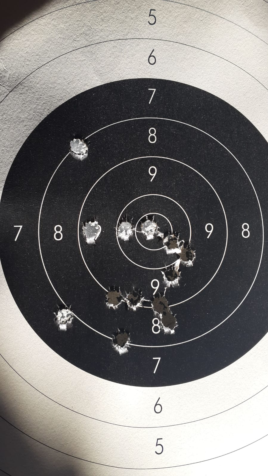 En el 8 arriba ala izquierda me ha pasado una cosa, tenso y al espujar el arma hacia el hombro noto que pierde tension correa y como soy asi no he tensado de nuevo y bumba, 8 arriba, siguiente disparo tensando despues de empujar al hombro ha ido al grupo en el 9 creo.