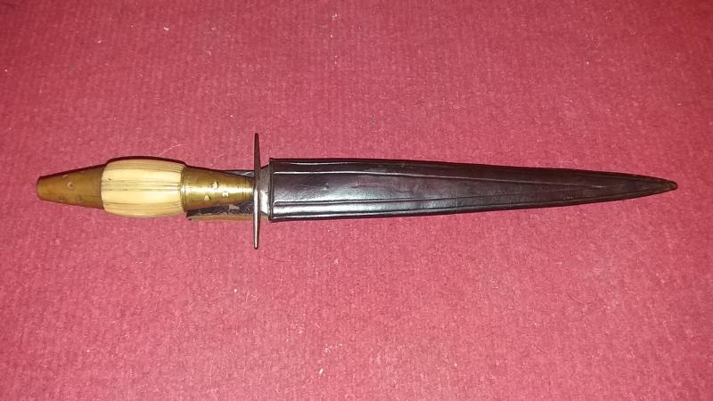 Es un puñal o cuchillo de defensa de tipo albaceteño, de finales del XIX, quizá principios del XX. Los había de dos tipos, unos de hoja algo más ancha, lomo recto y un solo filo, y estos otros, de doble filo y con guarda en cruz, más bien daga que cuchillo. A mí particularmente me parece una tipología muy atractiva, y desde luego debían cumplir bien su función.