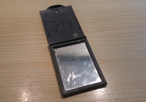 El escudo es el del Ejército de Tierra, por eso apunto a que sea un estuche para medalla, aunque el agujero de la tapa (parece para colgarlo de un tornillo) y el cierre por lengüeta me despistan. ¿Podría ser una caja para un espejo? No he visto nunca, pero tal vez alguien del foro sepa algo en esa línea.