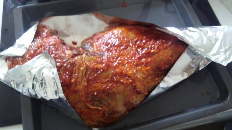 Primero las piezas las froté con una masa de ajo triturado aceite, pimientas molidas, orégano y sal por ambos lados. después cubrí toda la pieza y la cubrí de pimentón dulce. Cuando esté así lo embadurné con salsa barbacoa que hice con miel tomate azucar moreno etc. todo lo deje la noche en la nevera envuelto en papel de plata.
