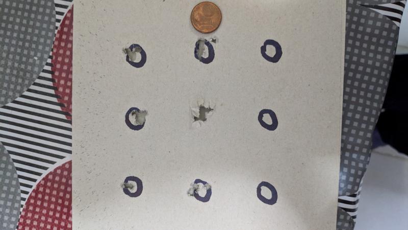 En la foto 5 disparos en cada agrupación a 10 metros, moneda de 1 céntimo de euro, el que se ha salido del "único" agujero, culpa mía por no meterlo ahí :mrgreen:
