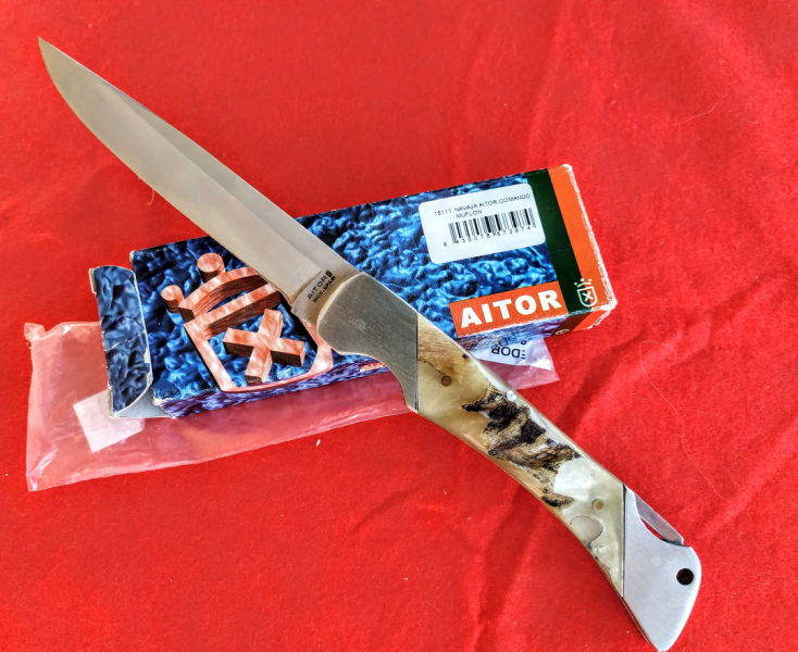 Navaja Aitor Commando modelo grande, de las primeras que fabricó Pielcu, aún con material de Ermua, hoja Troquelada, en una preciosa asta se cuerno de Muflon, nueva y en caja, cierre contundente como no podía ser menos en las Commandos.