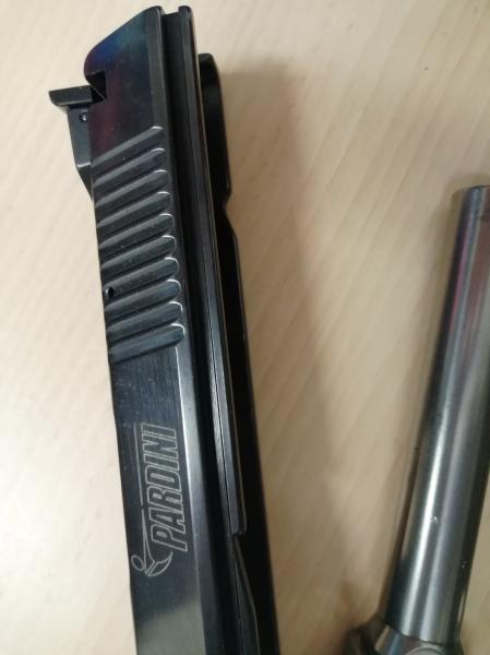la pistola tiene un cargador extra (tres en total), el muelle de la corredera que lleva puesto esta recortado para tirar munición recargada, pero entrego uno nuevo, y una base de aluminio +2 original Pardini.