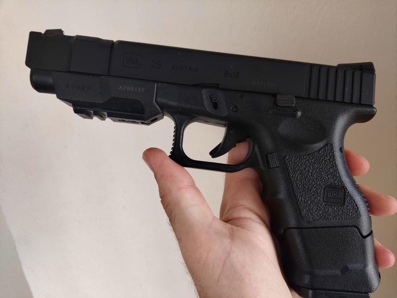 Pistola glock 18 semi y automatica con poco uso de la marca we a gas, alguna pieza cambiada por otra de mejor calidad ( no recuerdo cual), la vendo con dos cargadores y un cargador extendido de 50 bbs especial para el modo auto. Lo del mango se puede quitar, es una goma para mejorar el agarre.