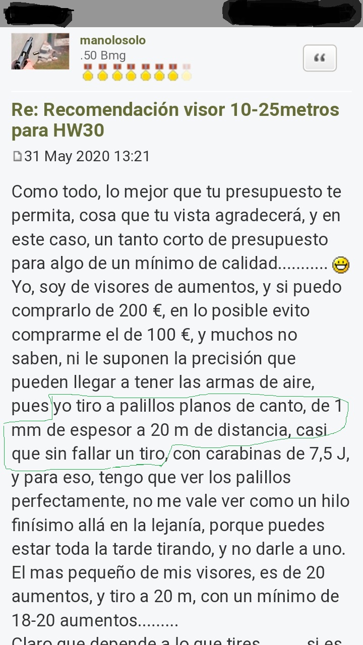 He visto darle a un ingles, a monedas de penique a 100 yardas con una Gamo de muelle de 150 €, sin fallar una, y con un viento del copón, otro, parte limpiamente por la mitad cartas de baraja, de canto, que son tres décimas de mm, a 25 m de distancia, cuando ya cuesta un huevo y parte del otro, darle a esa distancia a un palillo, y es 1 mm de espesor, no 0,3 mm.......![]()