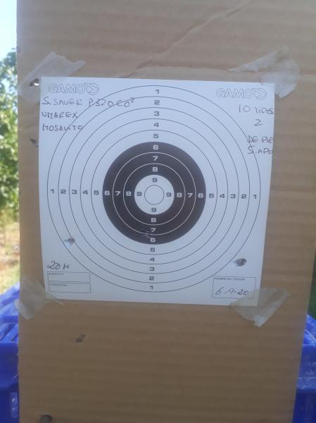 Me dispongo a tirar directamente a 20m,medidos escrupulosamente con la munición descrita.Han sido cuatro tandas,de 10 tiros......20 con cada clase de balín.No he hecho centrado previo,pues mi intención es solo tocar el cartón 14x14 (por los coj...) que parece fácil.