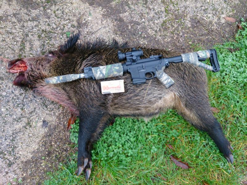 El 300 blackout la única ventaja que tiene es que puedes repetir rapidísimo los disparos y con mayor precisión y así tener más posibilidades de hacer más de un canal de sangrado, pero vamos que un jabalí a plena carrera con un disparo sólo y la adrenalina a tope a más de 60 metros con este cartucho no lo veo.