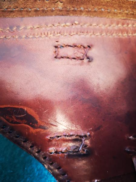 Aqui vemos los restos del cosido de la fijación de la bolsa porta herramienta, y los restos del cosido de la trabilla de sujeción de la baqueta
