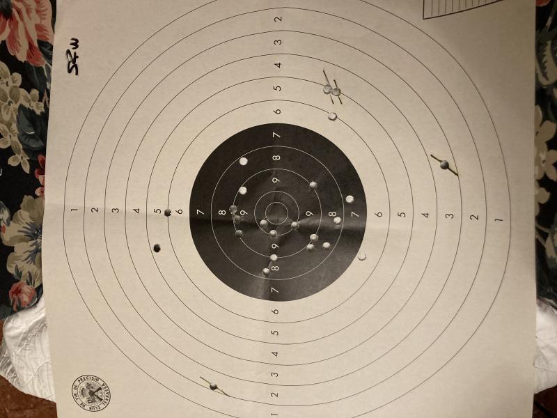 El dia que estrené mi Simth&Wesson K14, comprado en subasta por 62€, los tiros tachados son de otra tirada, los dos de arriba (a la izquierda en la foto, me ha salido tumbada), los dos primeros, para ajustar alza, el resto, todos al negro menos un par de errores mios.