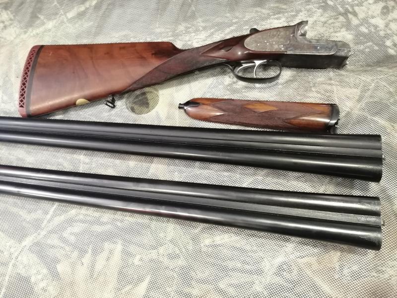 Extraordinaria escopeta muy poco común , increiblemente polivalente gracias a sus medidas (65cm ambos cañones ) con 17,7 y 18,4 decimas en un caso y 18,1 y 18,4 en el otro. Perfecta de maderas ,pavón y mecanismos .Culata a 36,5cm.Maderas de nogal selecionado.Cambio por rifle de calidad de mi interés.