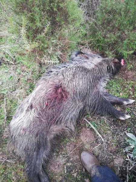 Este último, lo tiré a 100 metros, no paraba de moverse, y al dispararle en movimiento, se me quedo el tiro un poco retrasado por detras de la paletilla. A pesar de tener dos buenos boquetes de entrada y salida, corrio 60 o 70 metros. Por lo que para que el bicho se te quede en el sitio, lo mas importante es la colocación del disparo.
