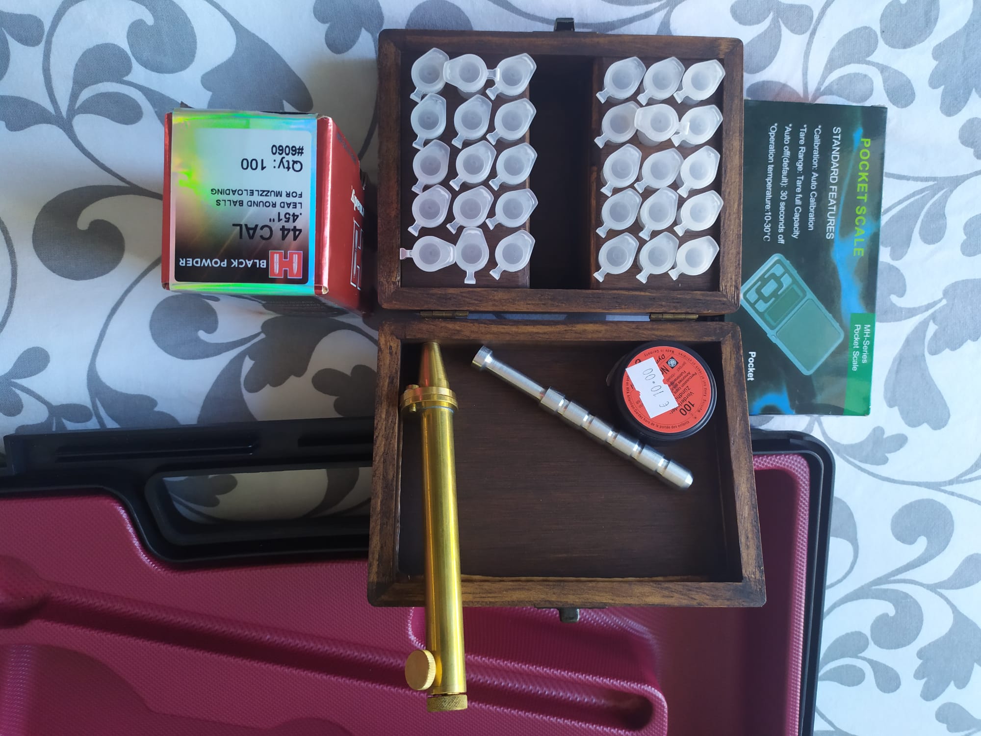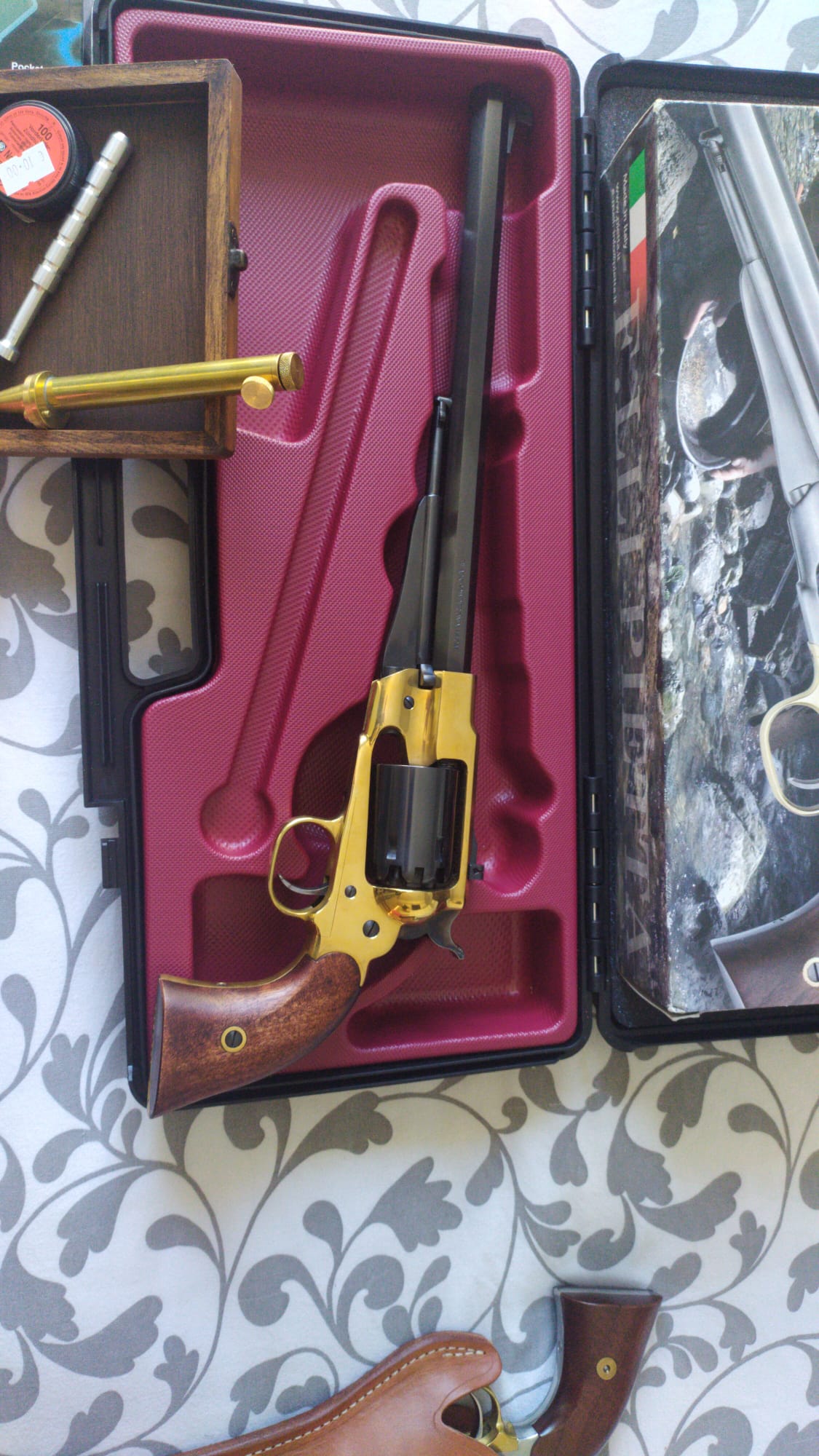 Caja de pvc para transportar el revólver marca Pietta, funda de cuero importada de USA, caja de madera para transportar las dosis de pólvora, dosificador, báscula digital, prensador de aluminio, una caja de pistones y otra de bolas.